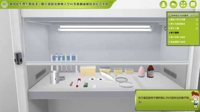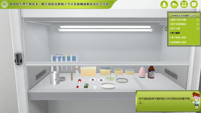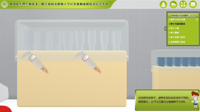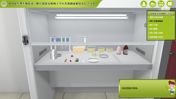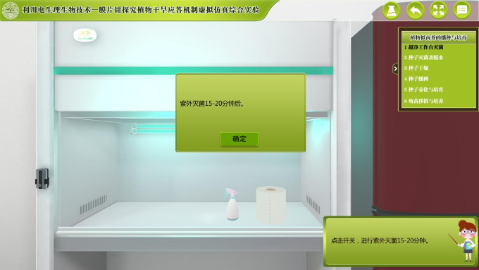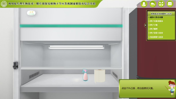 步骤 ①: 学生点击进入植物拟南芥的播种与培育模块。首先进行超净工作台的灭菌:拟南芥种子的播种需要在无菌条件下进行操作,因此在使用超净工作台前,点击75% 乙醇瓶,喷洒并擦拭工作台的台面,之后点击紫外灭菌灯按钮,进行灭菌15-20分钟。灭菌结束后,可以打开超净工作台开始种子的播种实验(图8)。