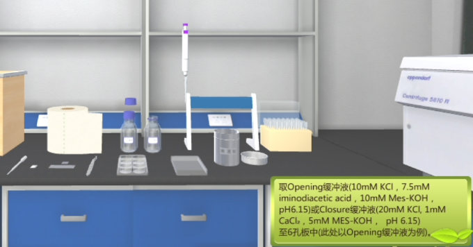 步骤 ⑥:学生回到实验操作主界面,点击进入拟南芥的气孔运动实验模块。拟南芥叶片的孵育:点击Opening缓冲液或者Closure缓冲液,加入六孔板中。拖拽左侧的剪刀,剪取莲座叶片,拖拽左侧的镊子,将叶片下表皮接触缓冲液。Opening实验中,在温室条件下,用铝箔纸包住六孔板,避光处理2.5小时;Closure实验中,于温室环境下,光照孵育2.5小时(图13)。