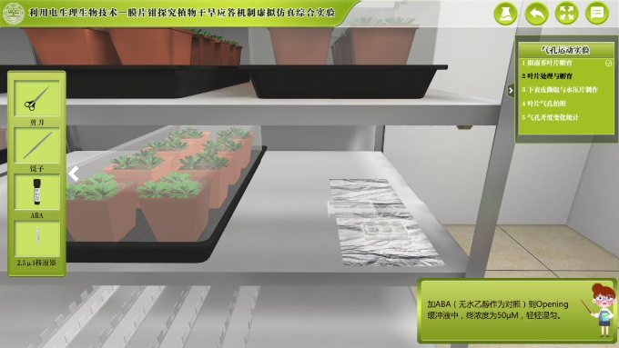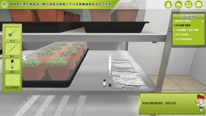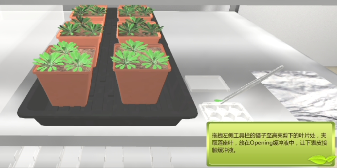 步骤 ⑦:拟南芥叶片的处理与孵育。拖拽左侧的植物激素ABA和移液器,将ABA加入孵育叶片的缓冲液中,进行处理。之后,在温室中继续孵育(图14)。