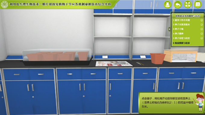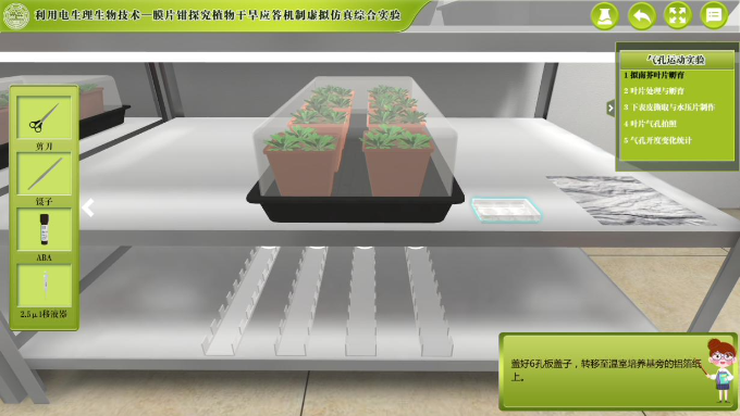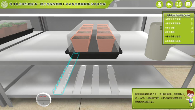 步骤 ⑤:幼苗的移植与培养。生长一周左右的拟南芥幼苗,移植到装有营养土的花盆中。首先点击竹签,在营养土中戳出四个洞,然后点击尖镊子夹住拟南芥幼苗下胚轴的部位,移到洞中。幼苗移植完后,重新放回温室,进行培养(图12)。该实验模块学习结束。