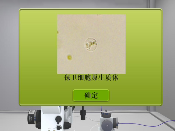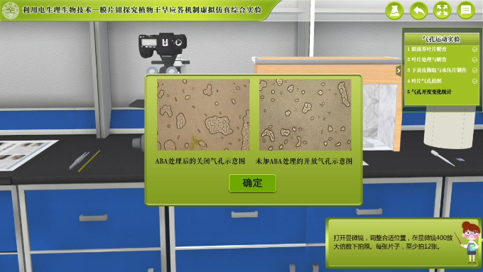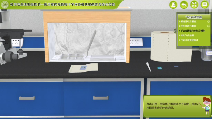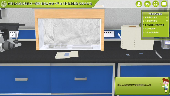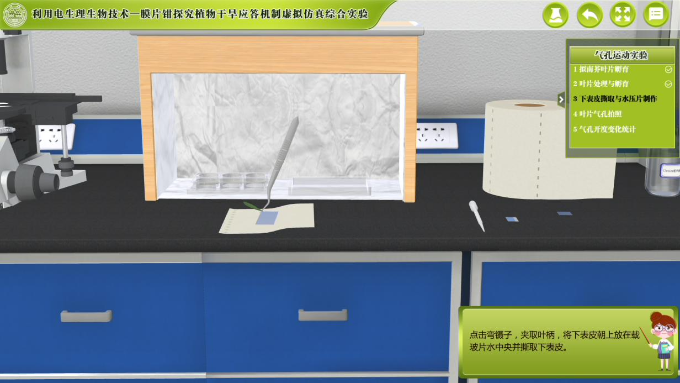 步骤 ⑧:拟南芥叶片下表皮的撕取与水压片的制作。2.5小时后,点击胶头滴管,在载玻片上滴一滴缓冲液。点击弯镊子,夹取叶片,下表皮朝上置于缓冲液上,用镊子撕取下表皮,除去多余叶肉,用吸水纸吸取多余水分,盖上盖玻片,用吸水纸轻轻按压,除去多余水分,完成水压片的制作(图15)。