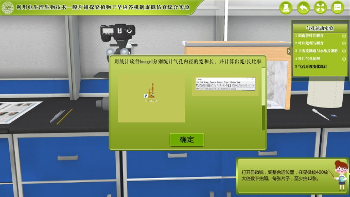步骤 ⑨: 拟南芥叶片气孔图像的获取和统计。点击桌面上制作好的水压片,置于光学显微镜下,在显微镜400倍放大倍数下拍照。之后,点击生物统计软件Image J分别统计气孔内径的宽和长,并计算出宽/长比率(图16)。本实验模块结束。