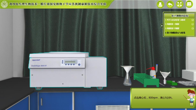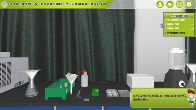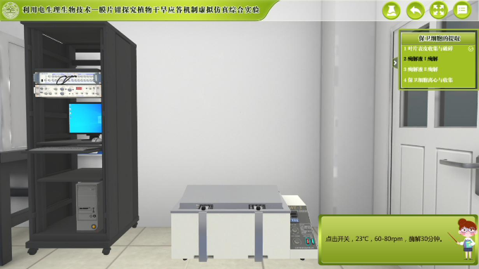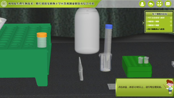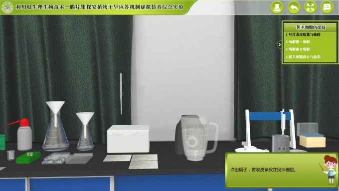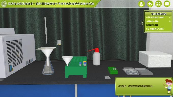 步骤 ⑪: 拟南芥保卫细胞的酶解与收集。分别点击镊子,收集破碎后的表皮条,点击装有酶解液Ⅰ的小烧杯,将表皮条放在酶解液里。之后,点击水浴摇床开关,将小烧杯置于水浴摇床上,进行第一步酶解过程。酶解30分钟之后,点击小烧杯,从水浴摇床中取出,点击镊子,将表皮条转移到酶解液Ⅱ中继续酶解。酶解结束后,点击离心管,将酶解液转移至离心管中。随后,点击离心机,进行离心与收集,并置于冰上备用(图18)。本模块实验结束。