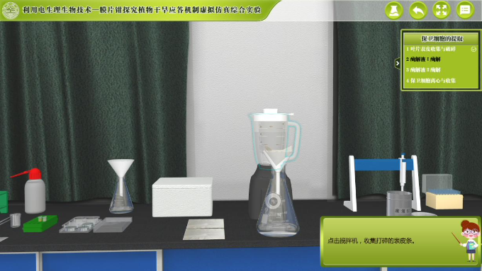 步骤 ⑩:学生点击回到实验操作主界面,点击进行植物叶片保卫细胞的提取模块。拟南芥叶片表皮的收集与破碎:点击镊子,撕取拟南芥叶片下表皮,并将表皮条放在搅拌器里打碎20秒左右(图17)。