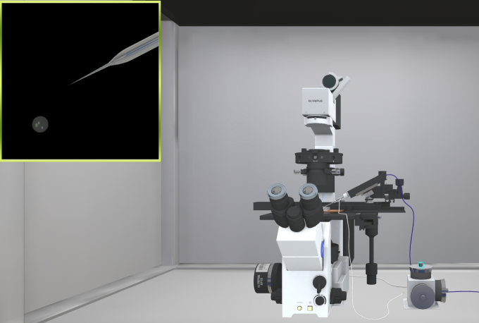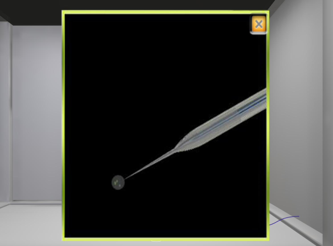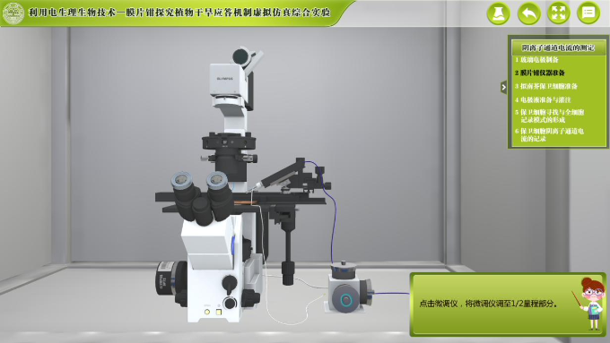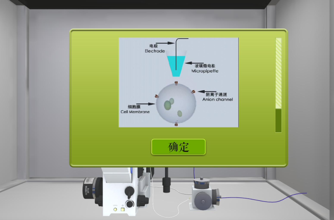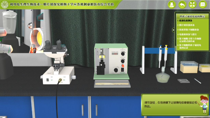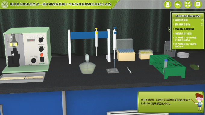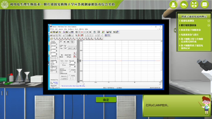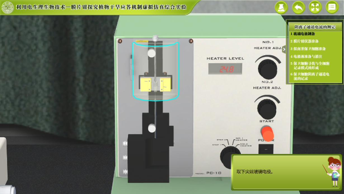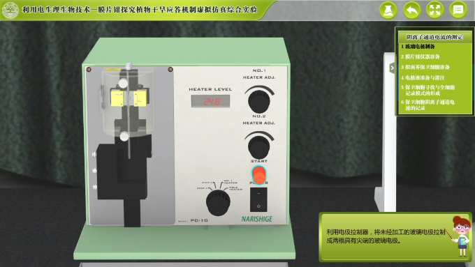 步骤 ⑫:学生点击回到实验操作主界面,点击进入植物保卫细胞阴离子通道电流的测定模块。膜片钳玻璃电极的制备:点击电极拉制器,将未经加工的玻璃电极拉制成两根具有尖端的玻璃电极。再点击抛光仪,对玻璃微电极的尖端进行进一步抛光处理,使玻璃电极尖端进一步圆润,并变成用于细胞吸附操作的粗度。制作好的玻璃微电极放置在橡皮泥条上,用于后续实验(图19)。
