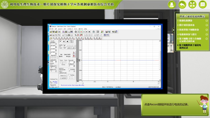 步骤 ⑭: 保卫细胞原生质体的寻找和阴离子通道电流的记录。点击显微镜,寻找状态合适的用于阴离子通道记录的保卫细胞原生质体(图21)。点击显微操作器,使玻璃微电极靠近并吸附到保卫细胞,利用负压的方式,使玻璃电极与保卫细胞质膜之间形成高阻封接,进而形成全细胞记录模式。点击膜片钳软件的记录按钮,记录阴离子通道电流(图22)。之后,分别关闭仪器和软件。本模块实验操作结束。