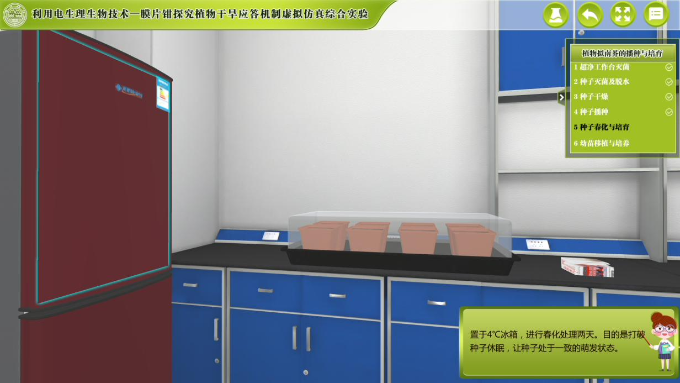 步骤 ④: 种子的春化与培育过程。点击冰箱,将刚播种后的培养基遮光后,置于4 ℃ 冰箱,进行春化处理两天。春化处理结束后,点击温室培养架,将培养基转移到植物生长温室(长日照条件,光照16小时,22 ℃;黑暗8小时,18 ℃)中进行继续培养(图11)。