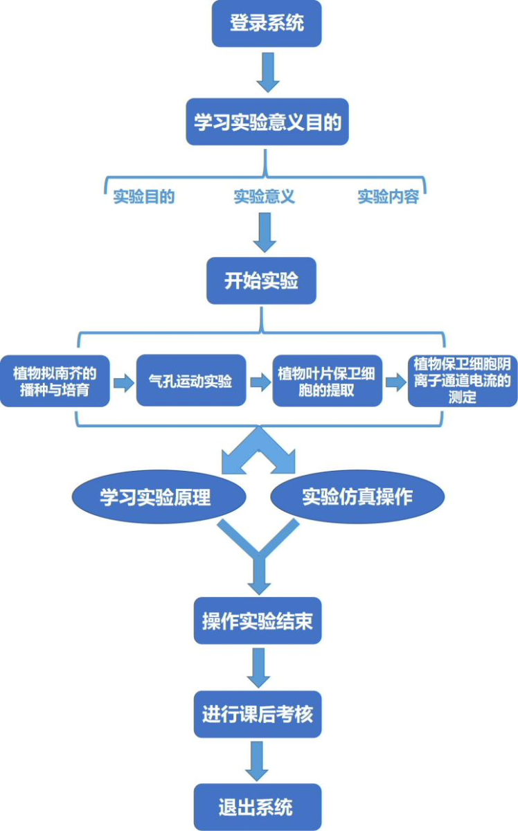 实验流程为:登陆系统 → 实验意义目的模块 → 实验目的 → 实验意义 → 实验内容 → 实验操作模块 → 植物拟南芥的播种与培育 → 拟南芥的气孔运动实验 → 植物叶片保卫细胞的提取 → 植物保卫细胞阴离子通道电流的测定 → 实验结束 → 课后考核模式 → 退出系统。(实验项目具体操作流程请见图2)