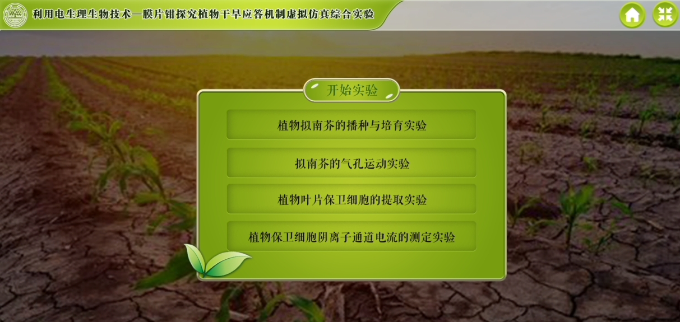 该实验教学项目所属实验课程为《植物生物学实验》,共计4个实验学时。其中,实验操作模块学习共计3学时,实验课后考核占1学时。通过三维仿真技术,虚拟利用膜片钳技术探究植物干旱应答的实验环境及操作情景,学生可在整个实验室场景和情景中进行交互式操作。